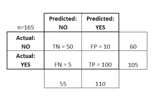 Here, TP stands for True Positive which are the cases in which we predicted yes and the actual value was true. TN stands for True Negative which are the cases in which we predicted no and the actual value was false.FP stands for False Positive which are the cases which we predicted yes and the actual value was False.FN stands for False Negative which are the cases which we predicted No and the actual value was true. (These are made up data from another dataset...just shown here for illustration.)